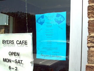 The front entrance to the Byers Cafe. They had a flyer up about the Benefit Run this Saturday, 7-10-10
